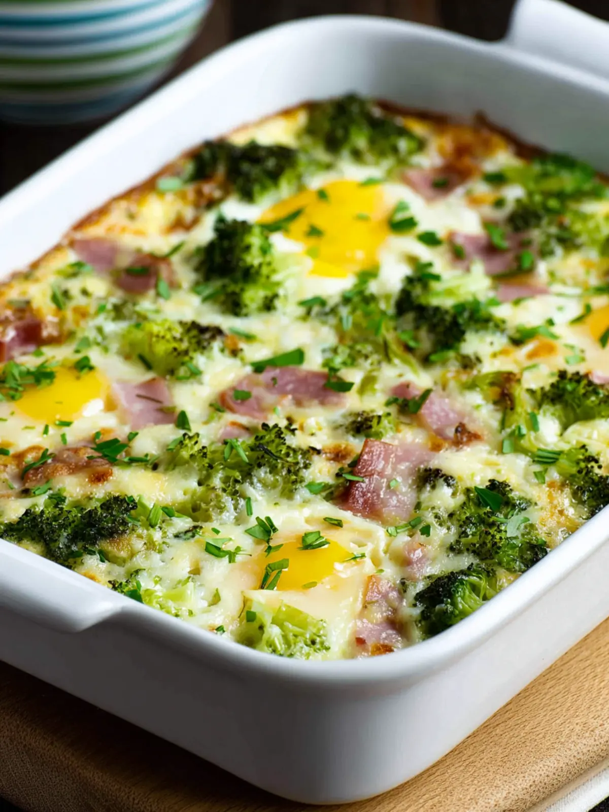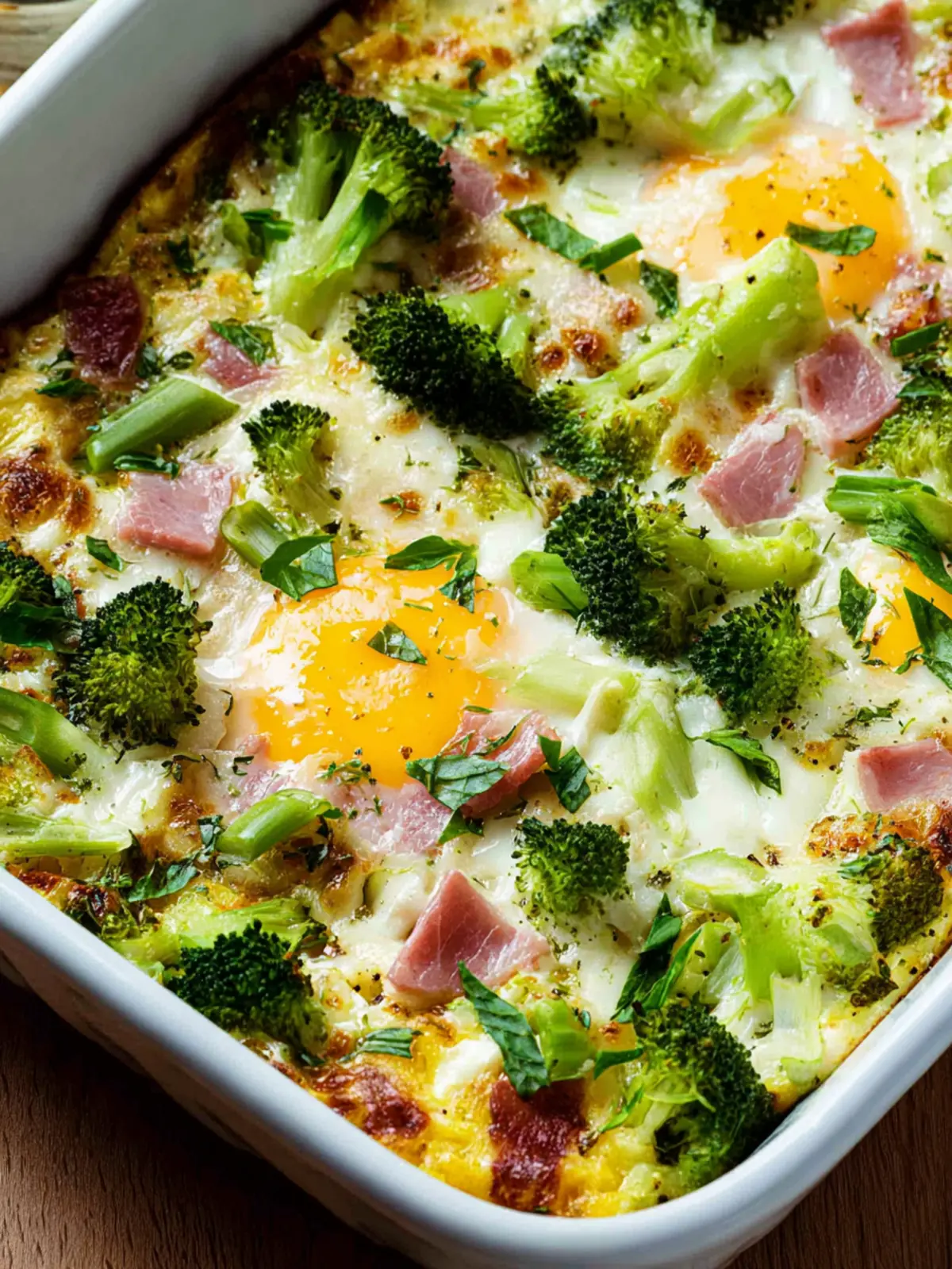 This savory bake combines broccoli, diced ham, and melted mozzarella cheese, all held together by a fluffy egg mixture.
