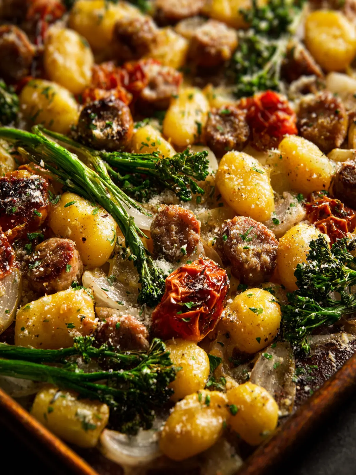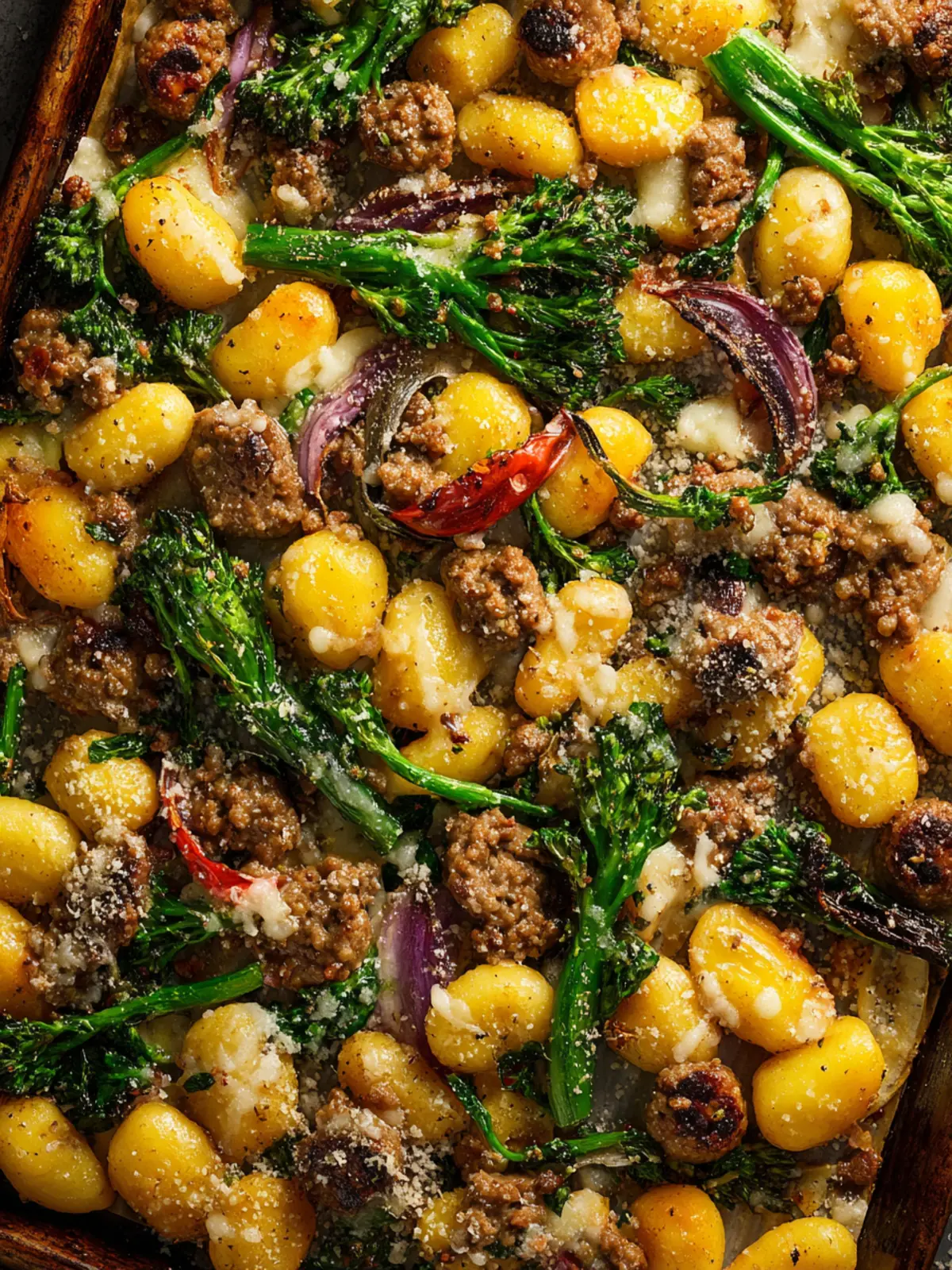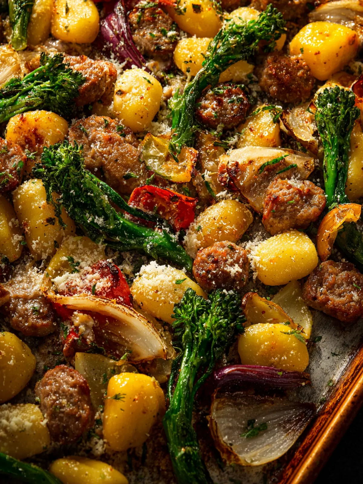 Gnocchi: I recommend using store-bought potato gnocchi for a quicker prep time. It cooks beautifully in the oven and absorbs all the tasty juices from the sausages and vegetables, creating a delightful harmony of flavors.