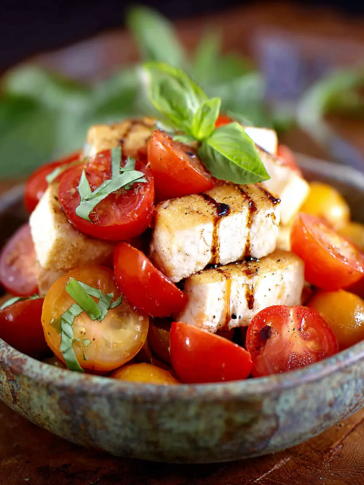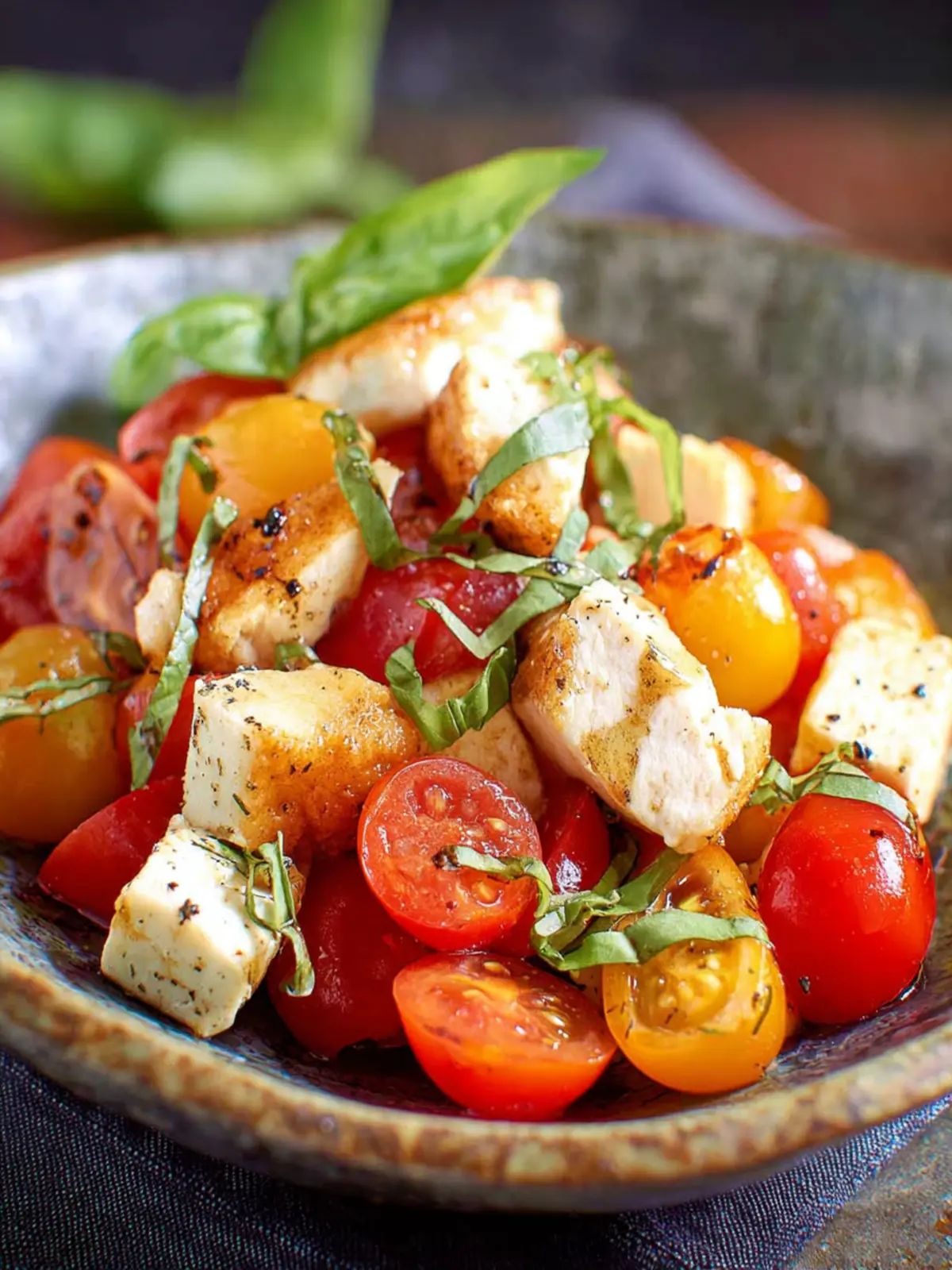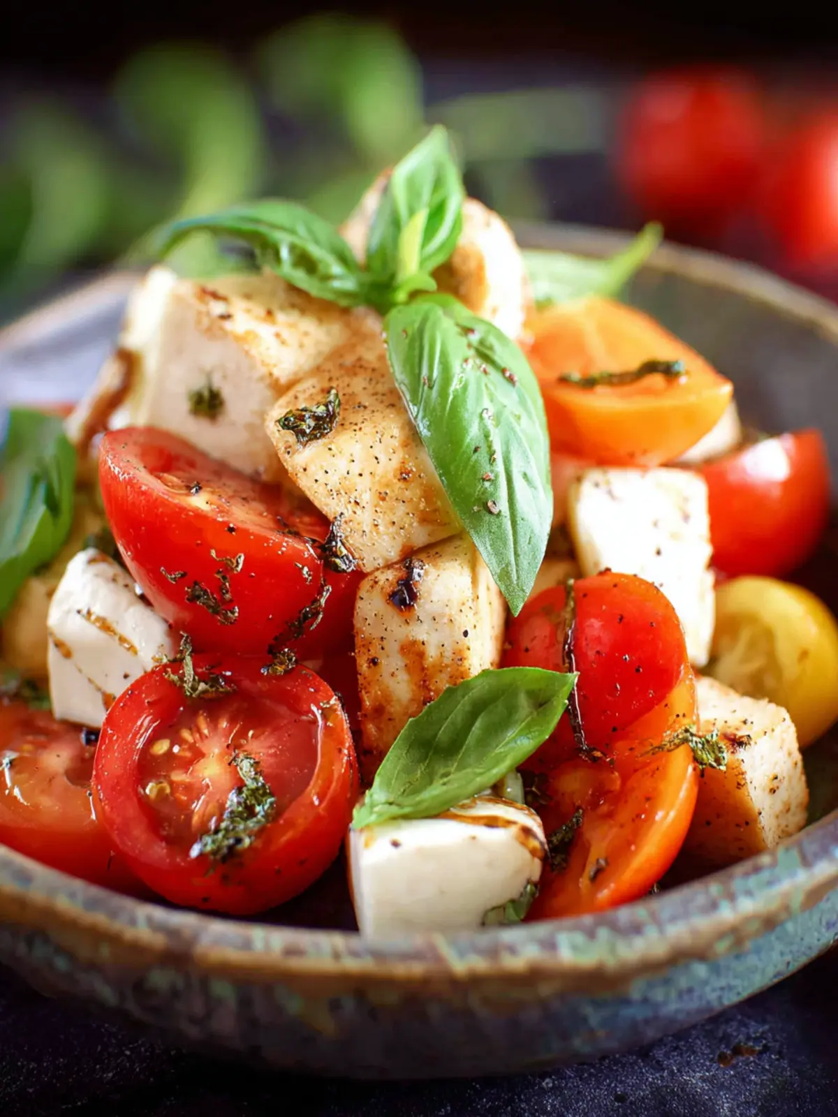 A refreshing chicken caprese salad with balsamic vinaigrette.