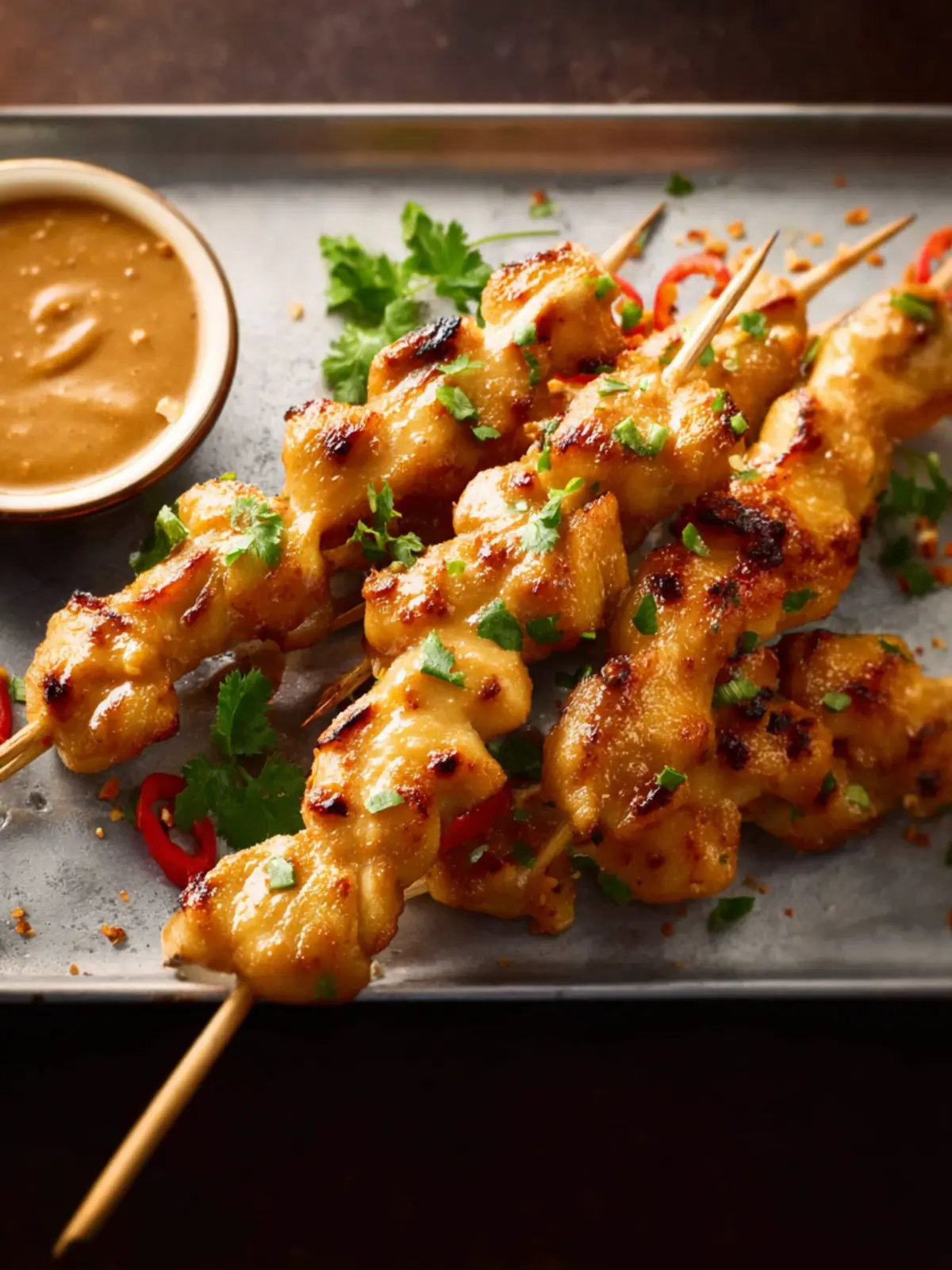 Delicious chicken skewers marinated in a creamy peanut sauce and baked to perfection.