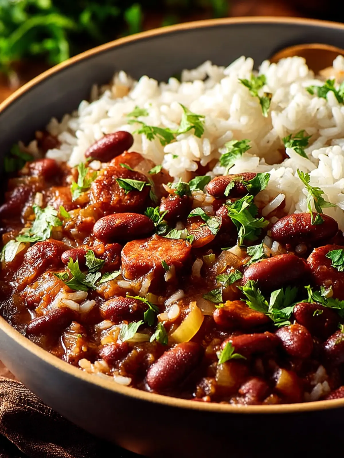 A hearty and flavorful Cajun dish featuring red kidney beans and sausage served over rice.