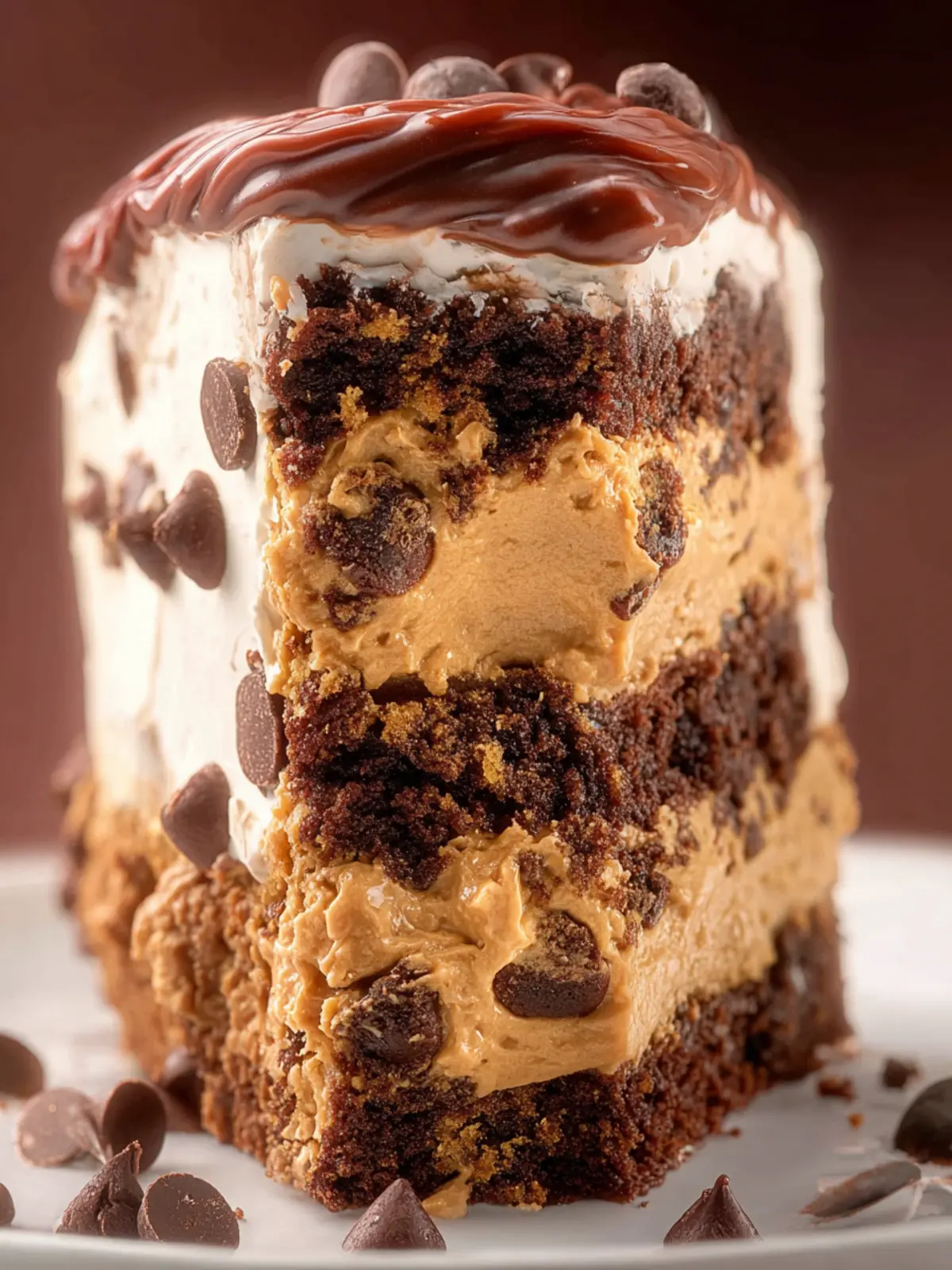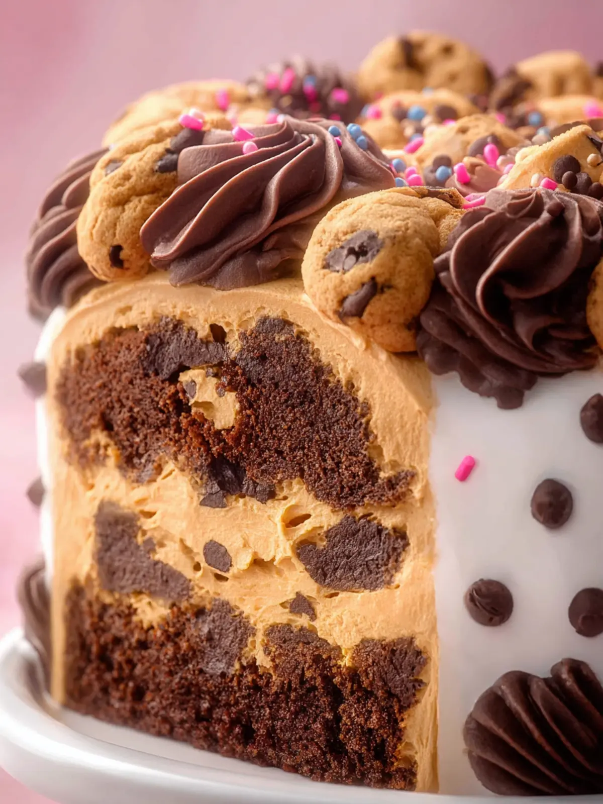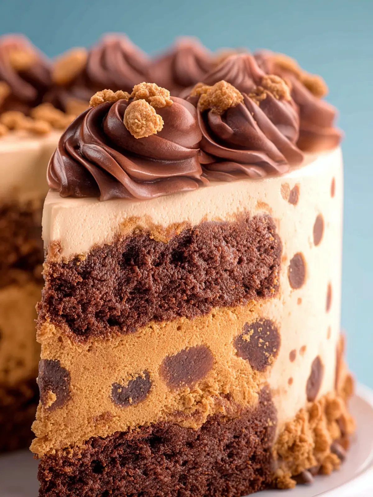 A delightful layered brownie cake topped with edible cookie dough and chocolate frosting.