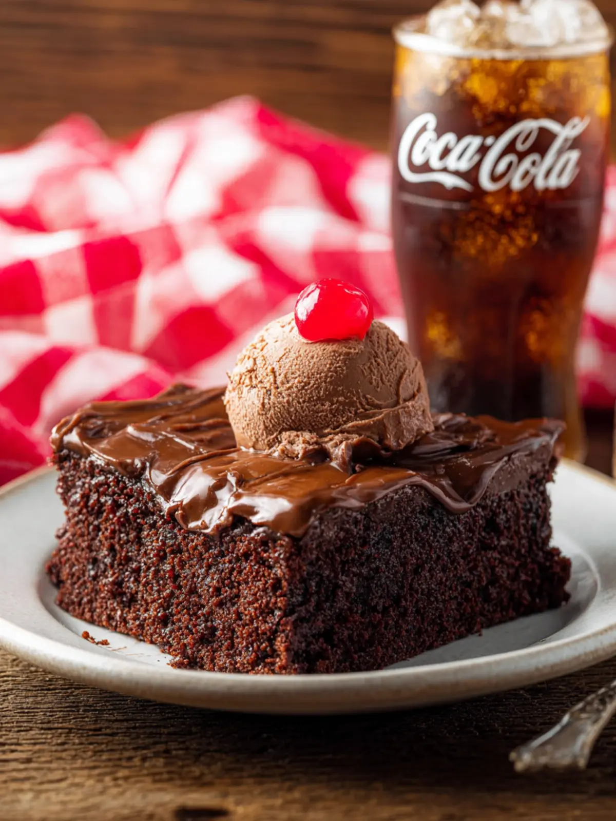 A rich and moist chocolate cake made with Coca-Cola, topped with a fudgy frosting.