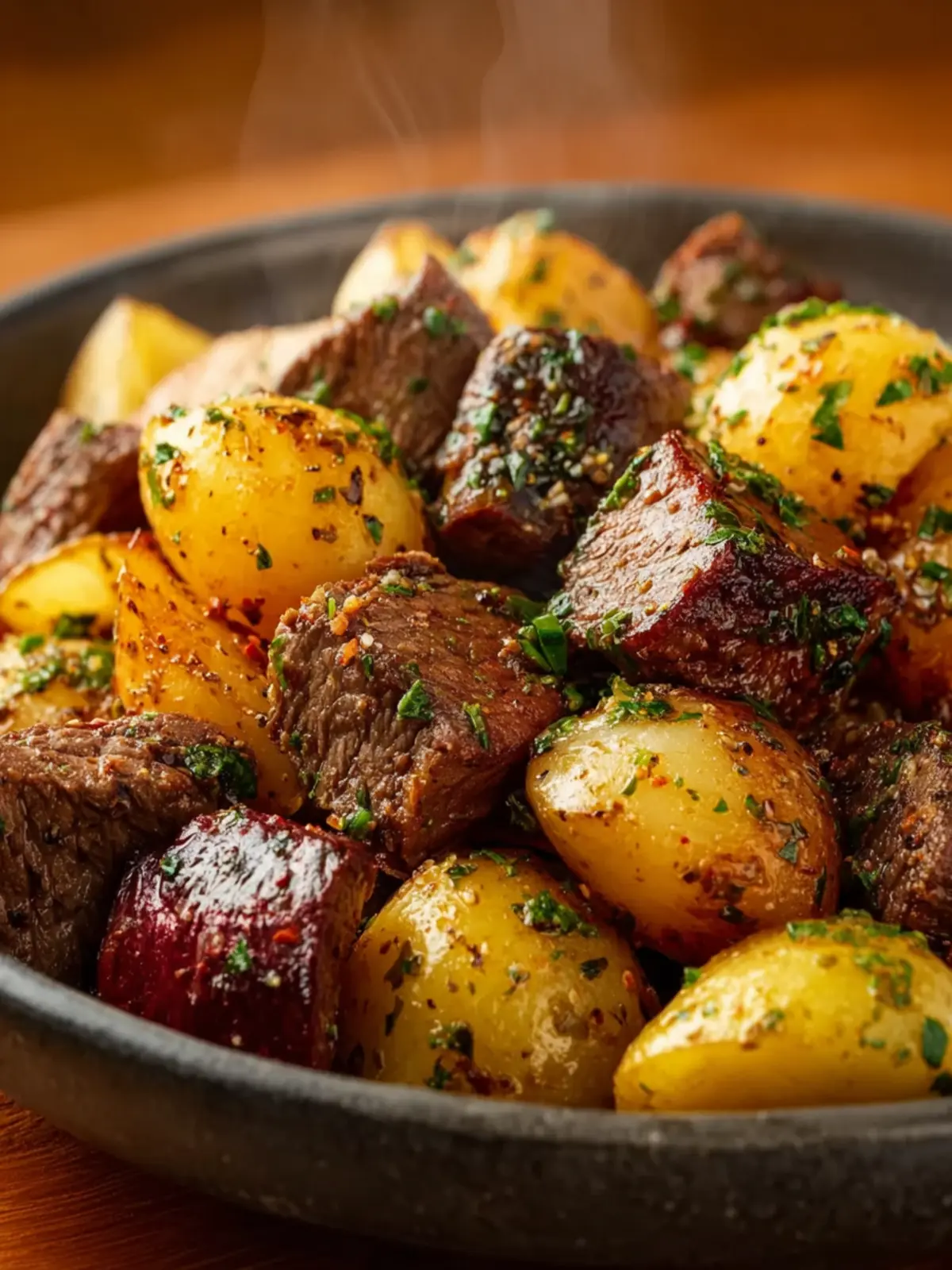 This dish comes together in a snap, allowing you to enjoy a hearty meal without hours of preparation. With tender steak cubes and perfectly roasted potatoes, it strikes the ideal balance between indulgence and ease.