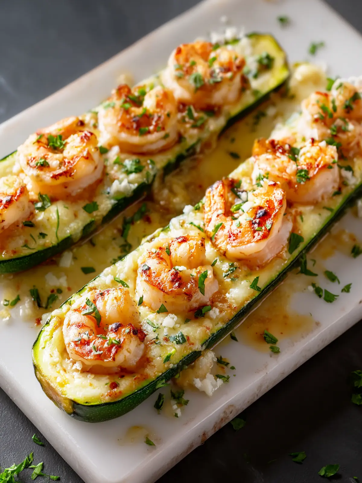 Delicious zucchini boats stuffed with shrimp, cheese, and creamy goodness.