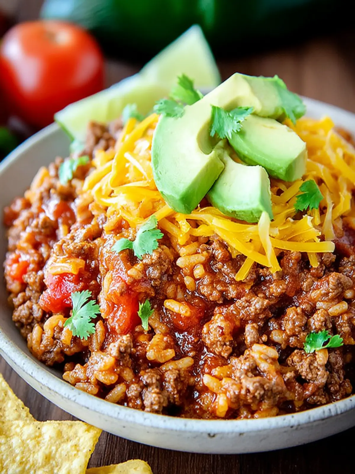 A delicious one-pot dish with lean ground beef, rice, and a flavorful blend of spices, perfect for a family dinner.
