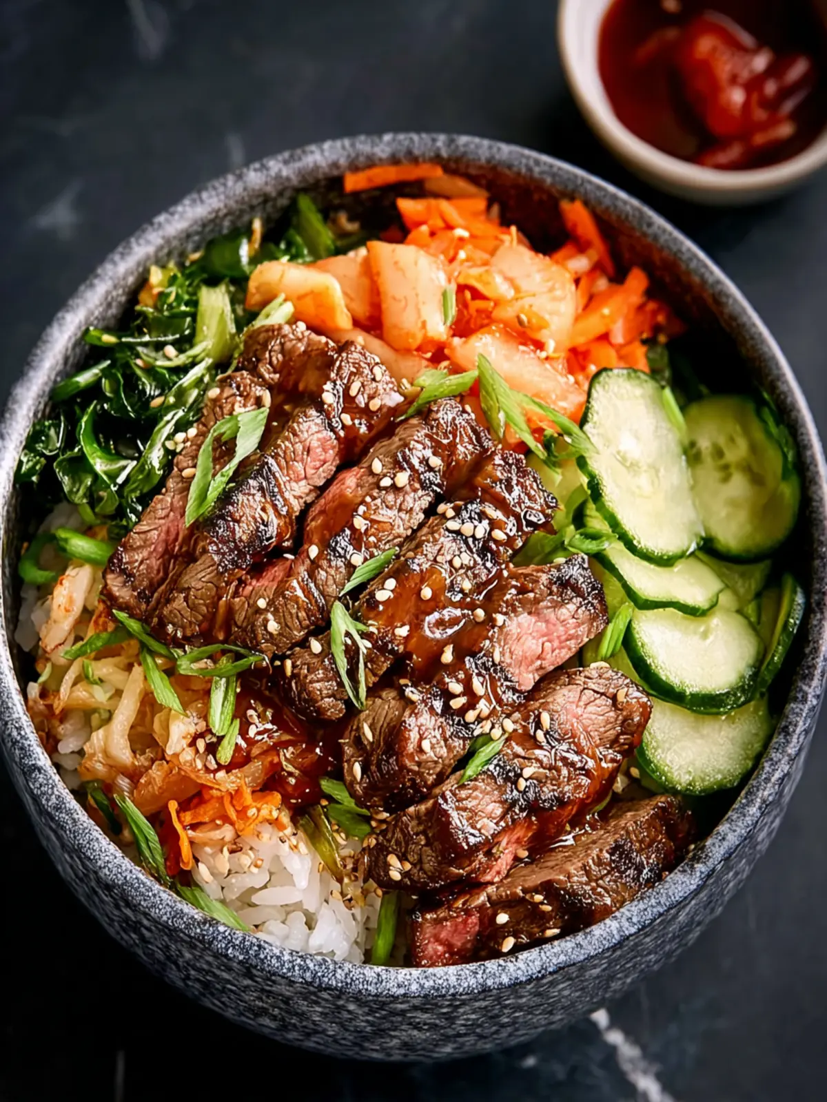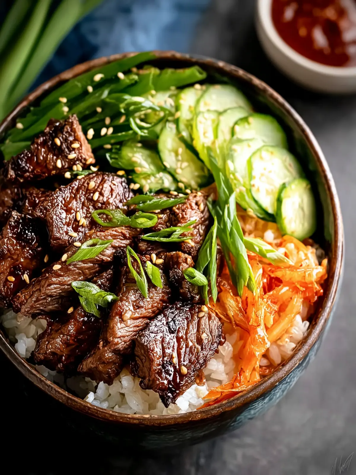 A delicious and savory Korean BBQ steak rice bowl that combines fragrant jasmine rice, marinated steak, and fresh vegetables, topped with sesame seeds and green onions.