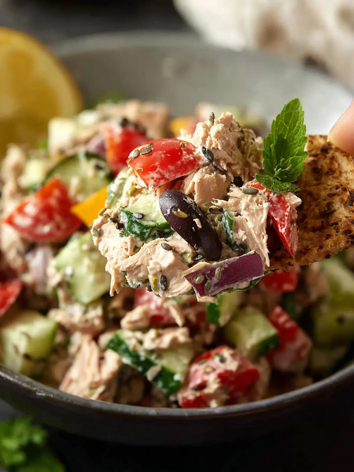 A refreshing tuna salad with a medley of fresh vegetables and herbs.