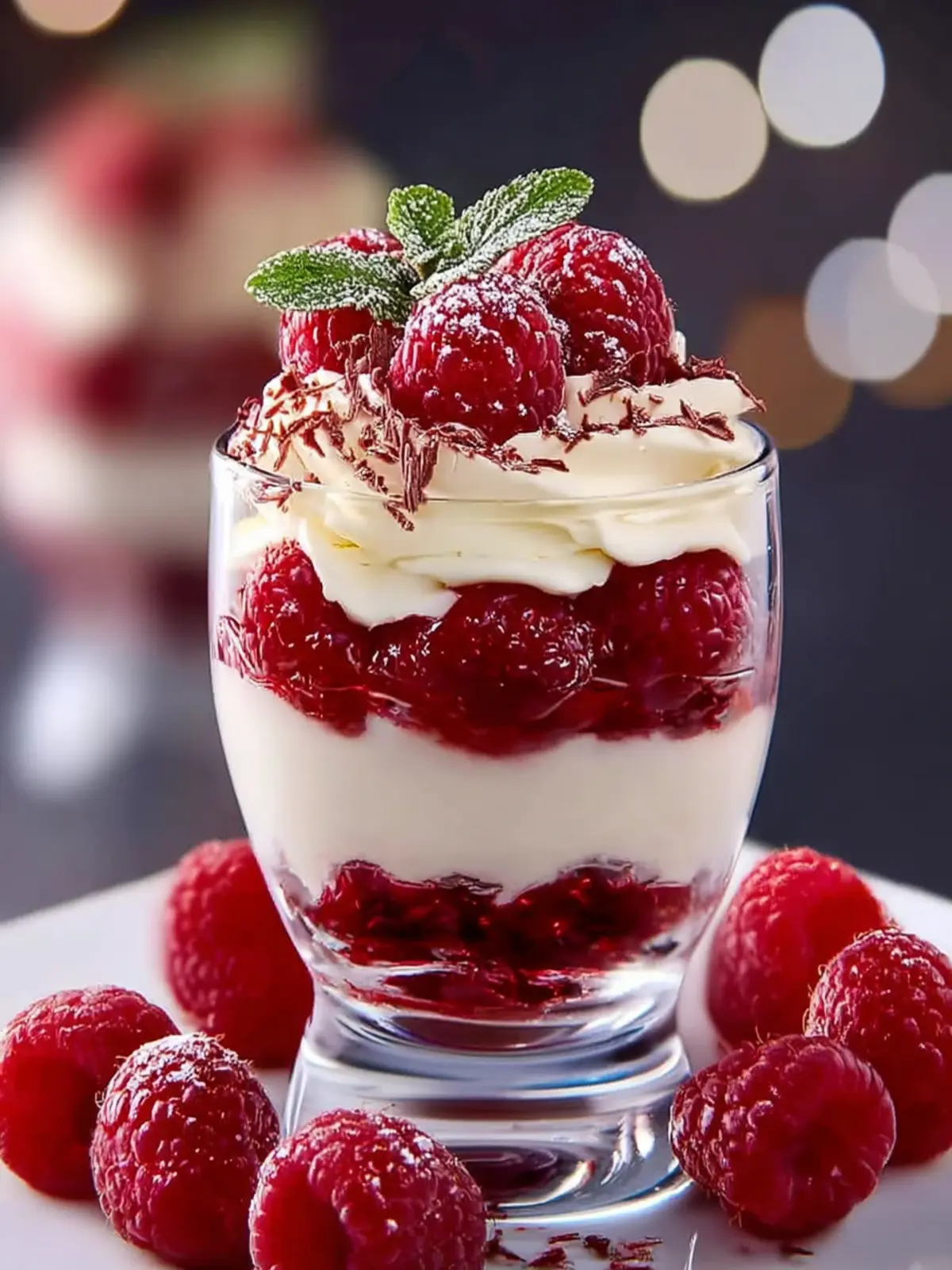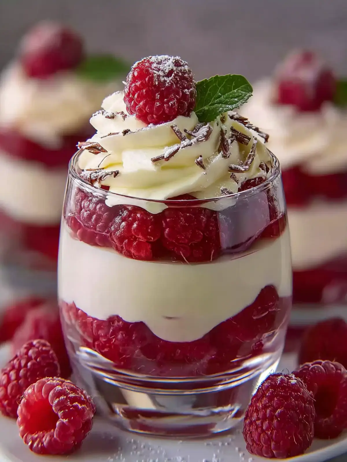 - Garnish: Top each parfait with fresh raspberries and chocolate shavings or curls.