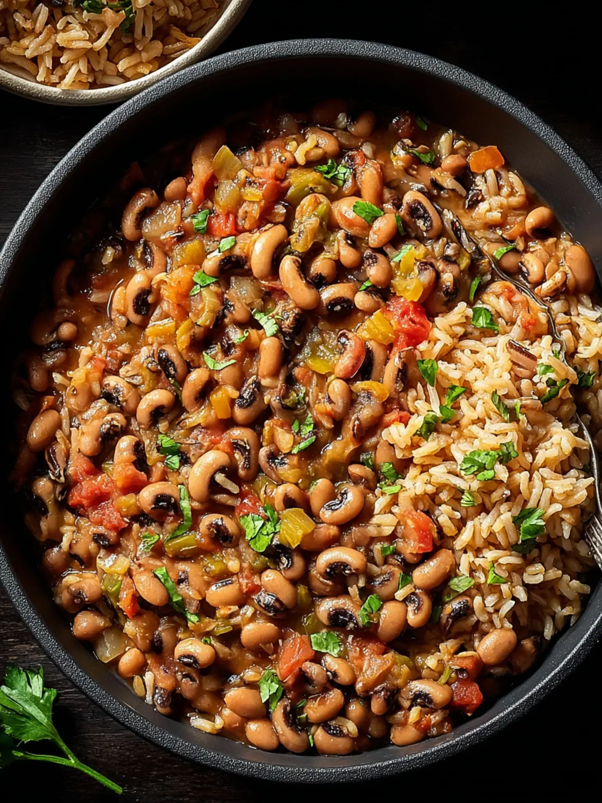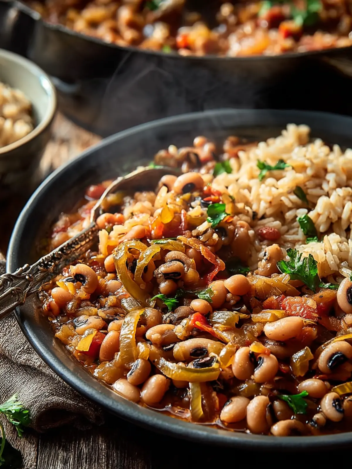 A hearty dish made with black-eyed peas and rice, seasoned with spices for a flavorful meal.