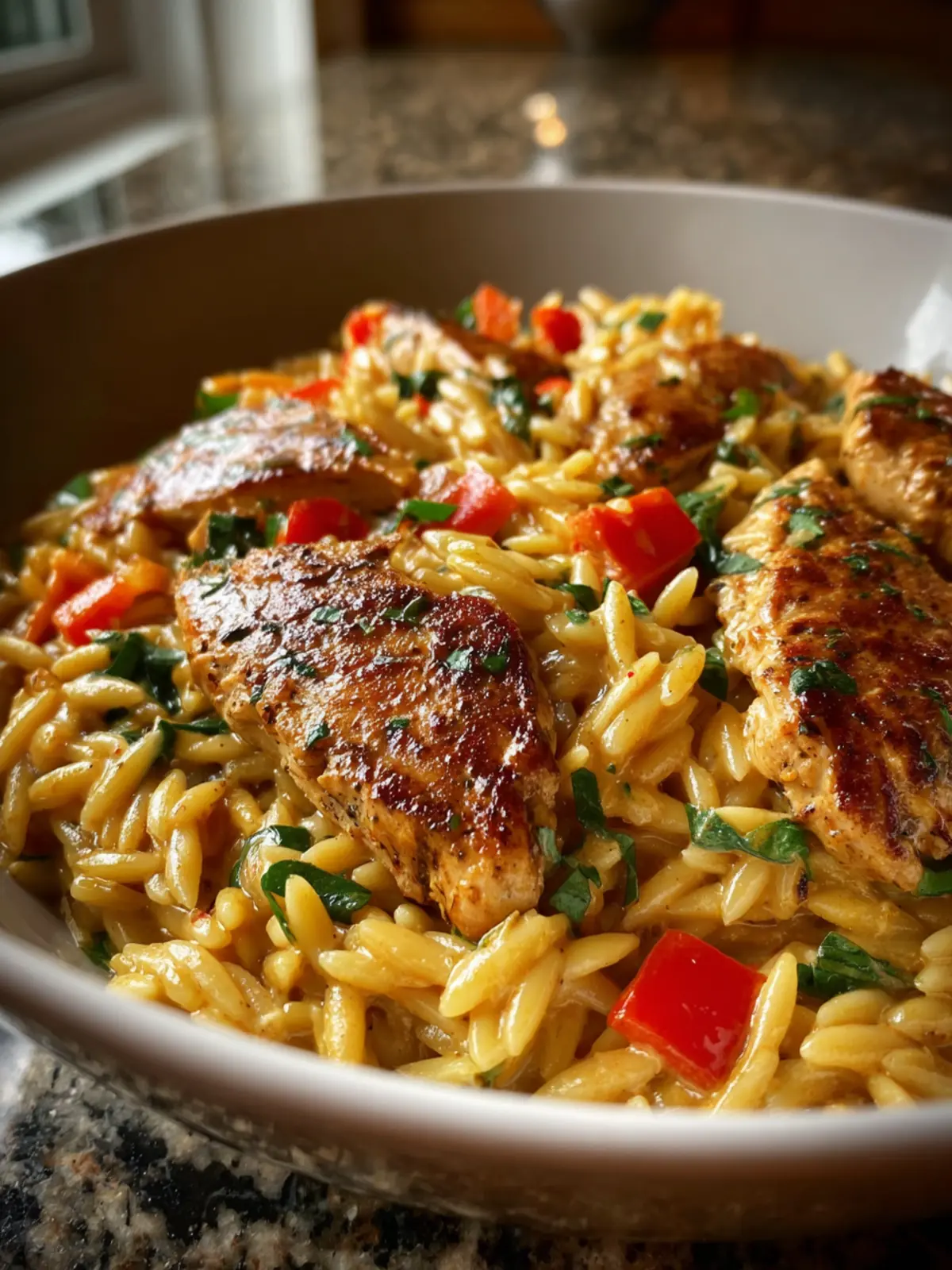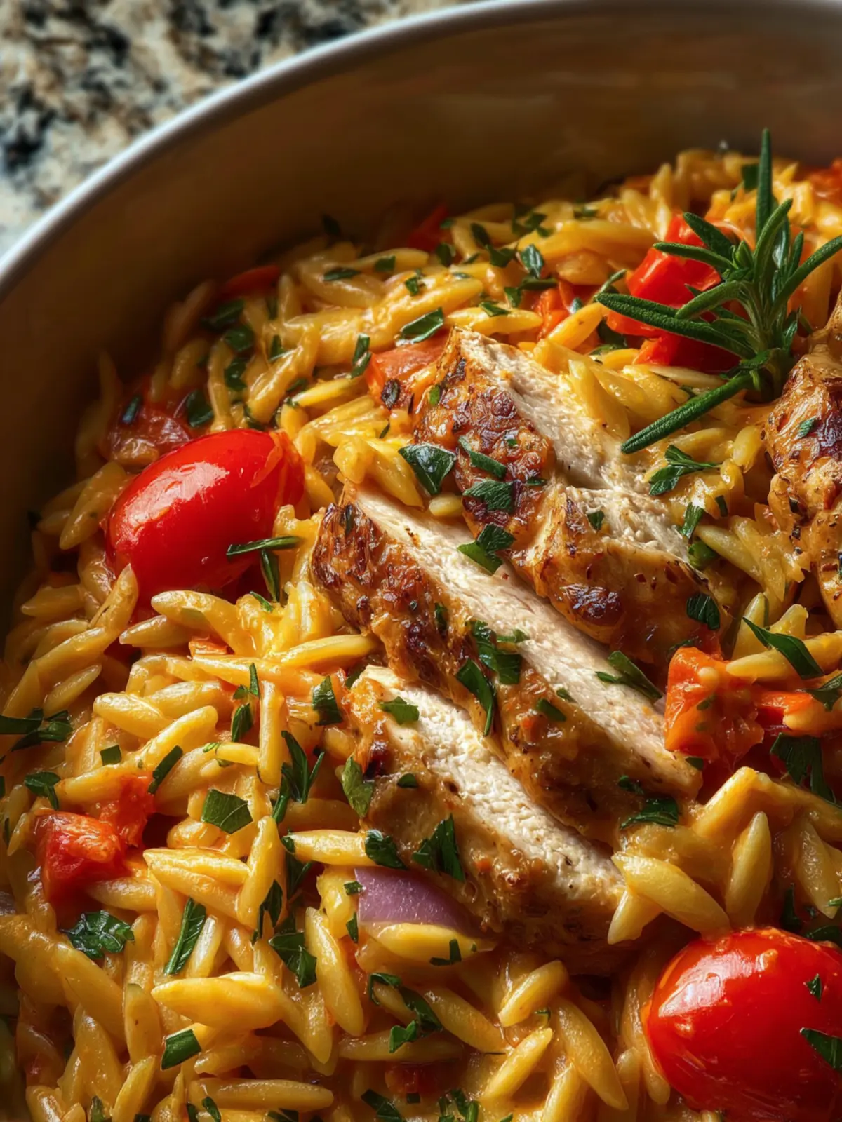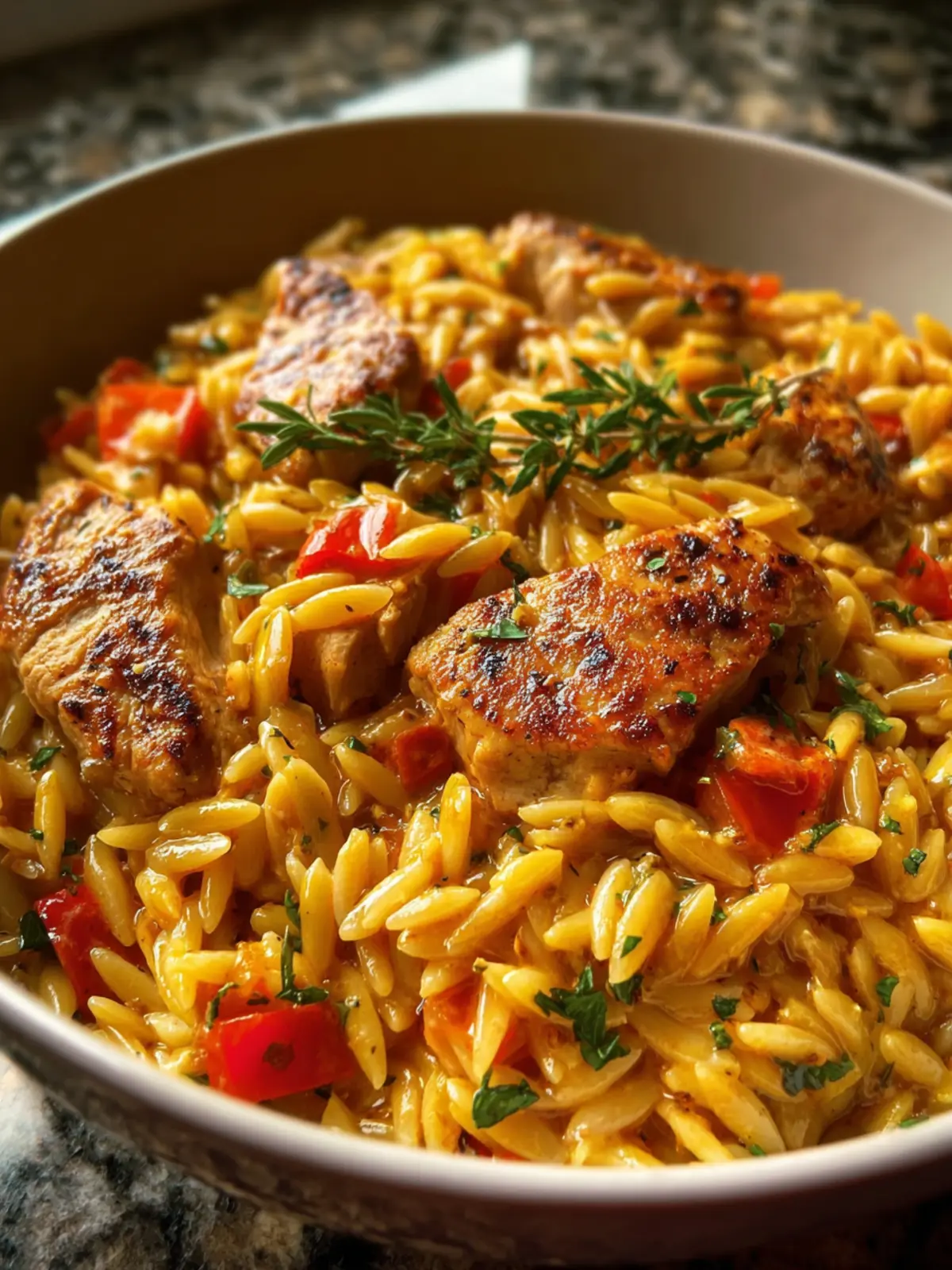 The creamy orzo provides a delightful contrast to the juicy chicken, making every bite a flavorful indulgence.