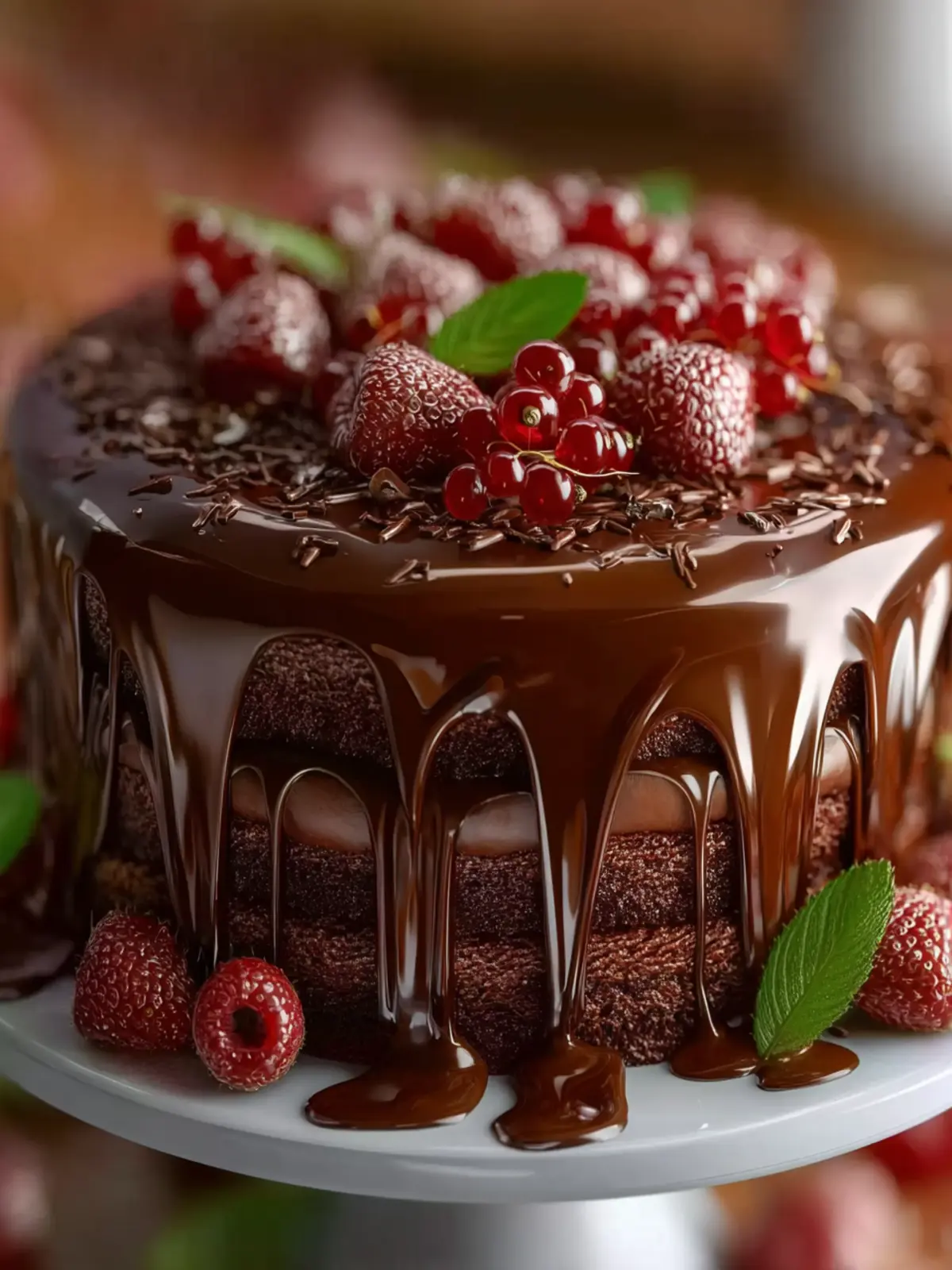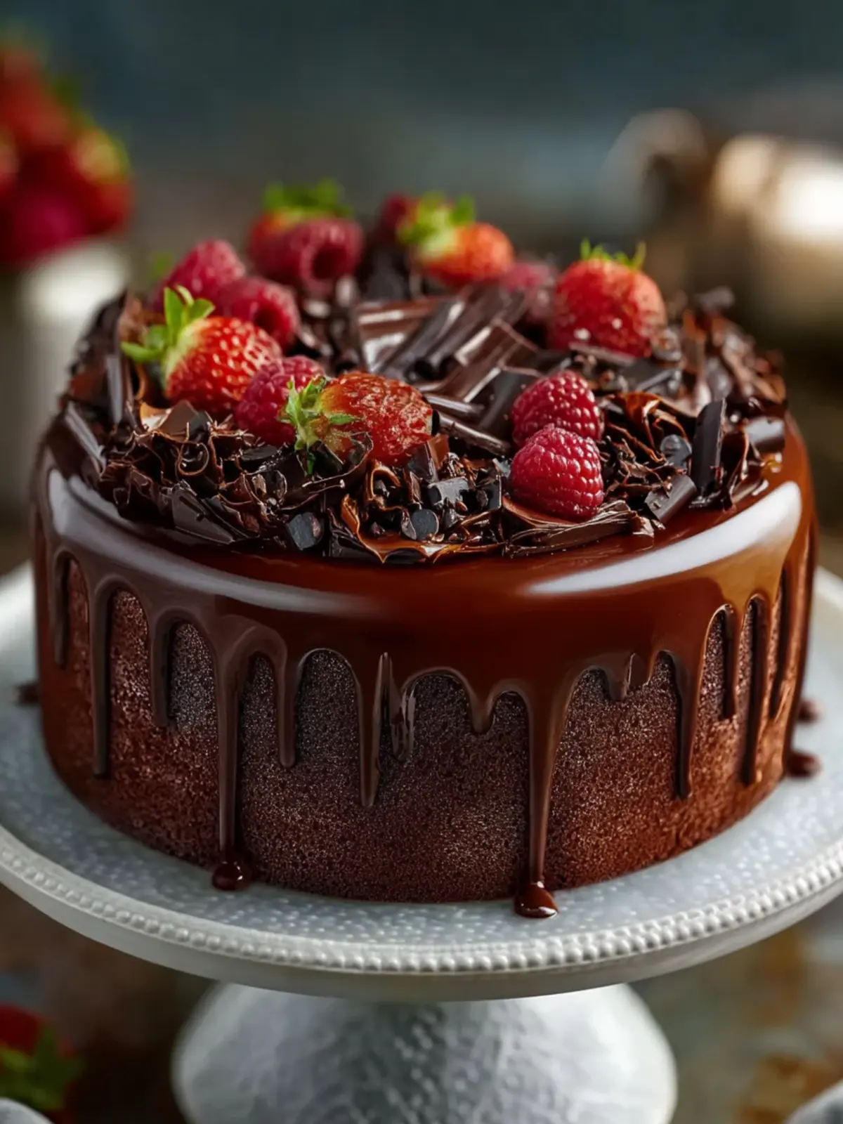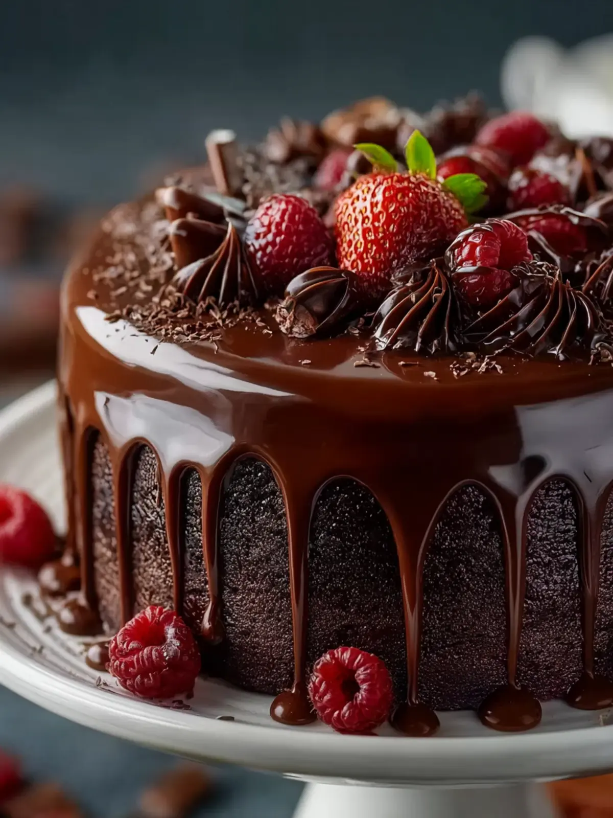 A rich and moist chocolate cake topped with a glossy ganache, perfect for any occasion.
